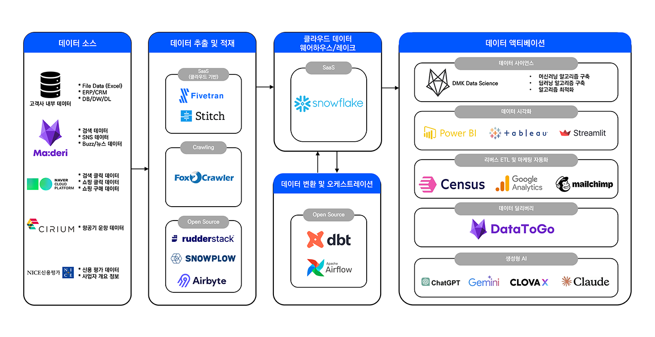 DMK는 정말 필요한 솔루션만 찾아 서로 연결하며 구성하는 모던 데이터 스택(Modern Data Stack)방식으로 비용효율적인 맞춤형 데이터 플랫폼을 구성합니다.