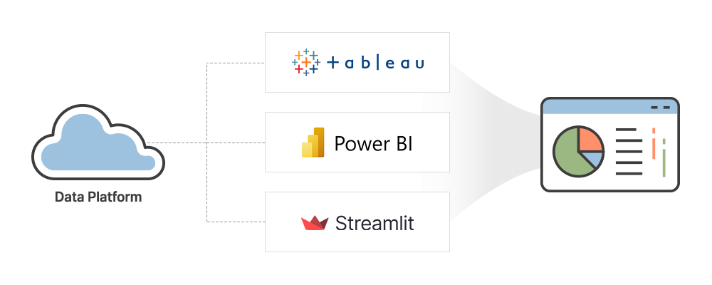 맞춤형으로 구축된 데이터 플랫폼에 Tableau, Power BI, Streamlit 등 최신 BI 솔루션을 연결하여 누구나 쉽고 직관적으로 이해할 수 있는 대시보드를 기획, 구축합니다.