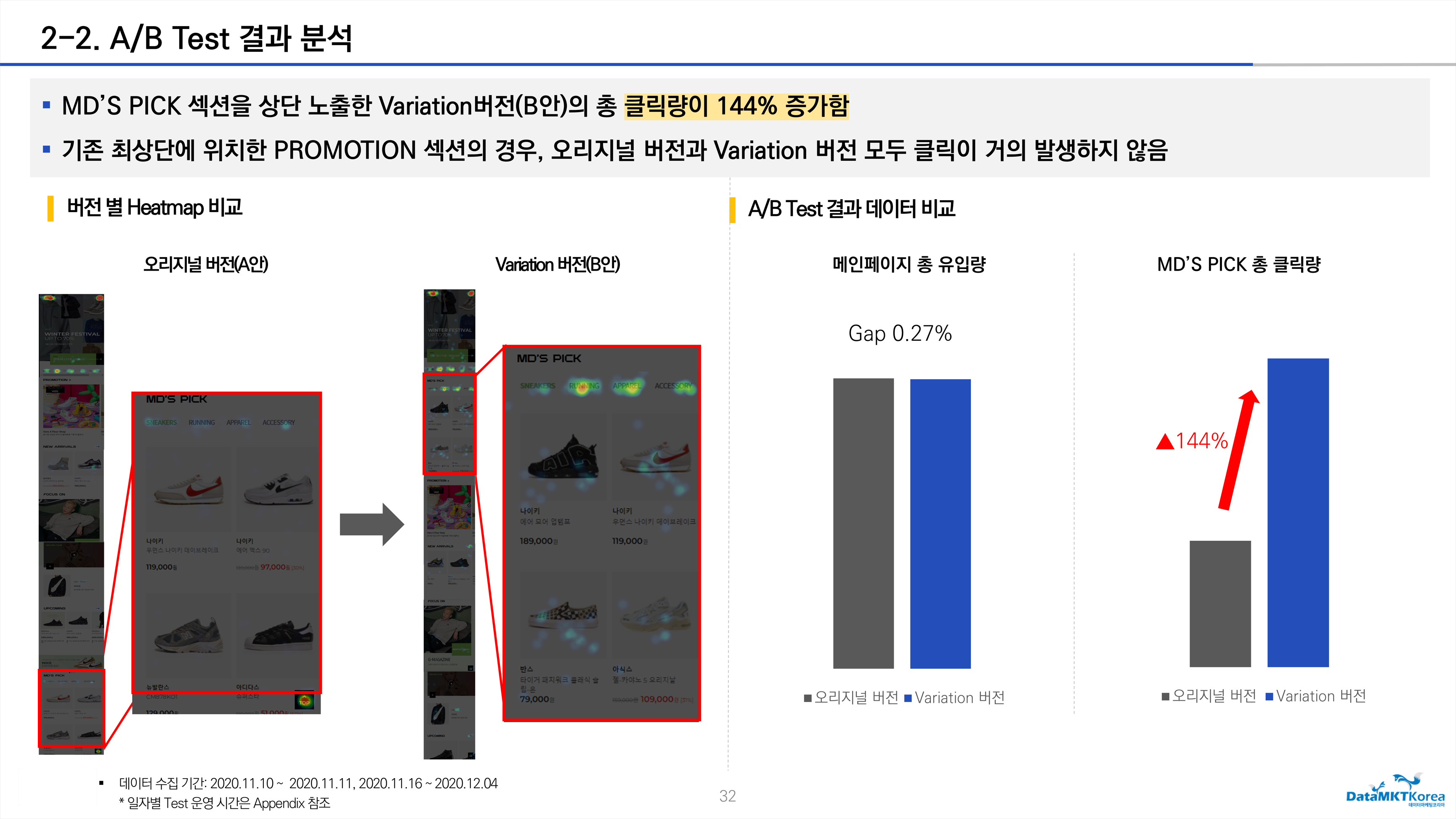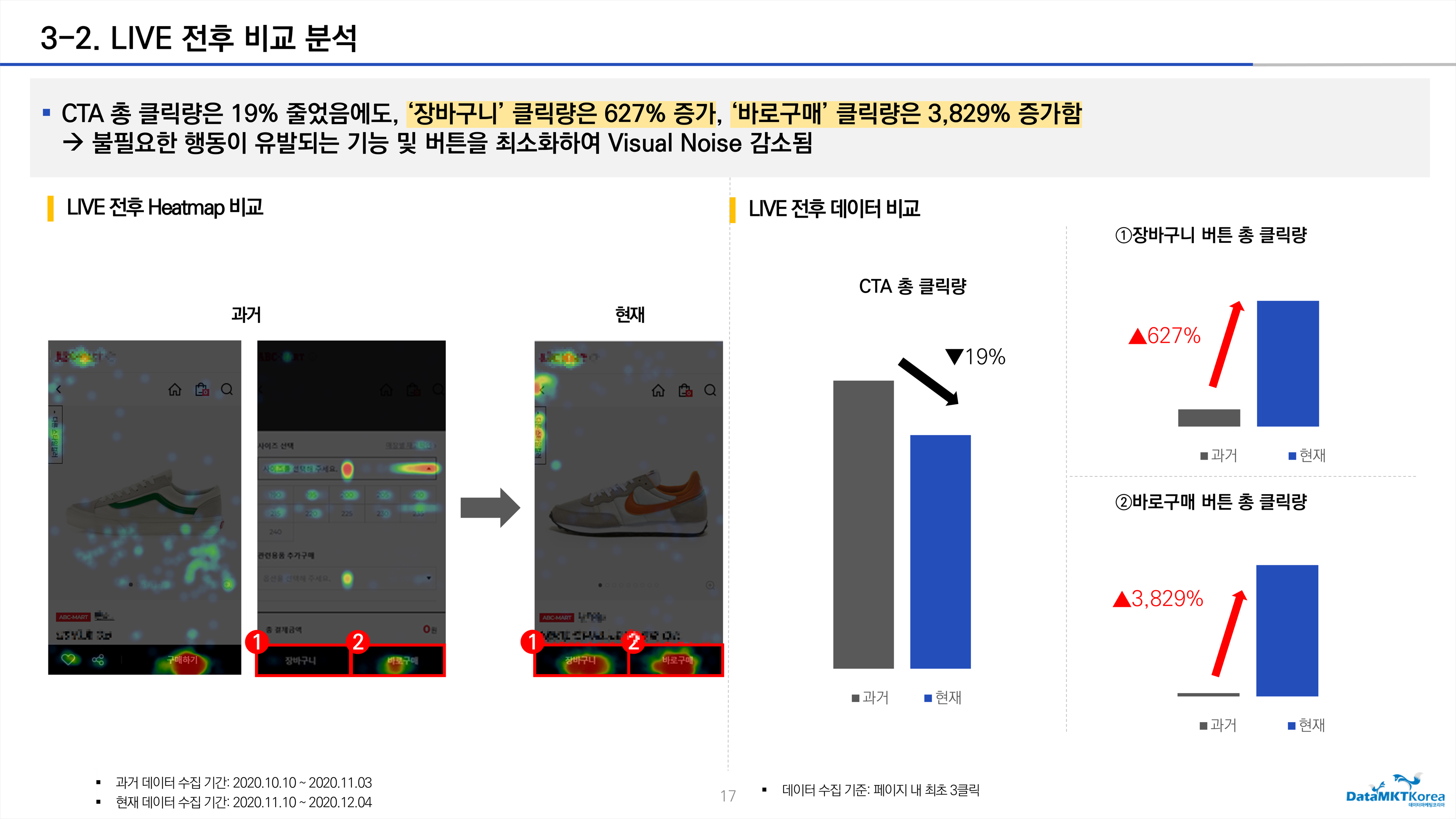 쇼핑 App 및 모바일 웹 페이지 내 사용자 구매 행동 데이터 분석하여 UI/UX를 개선한 결과 '바로 구매' 버튼 클릭량이 17건에서 668건으로 3,800%가량 증가하고