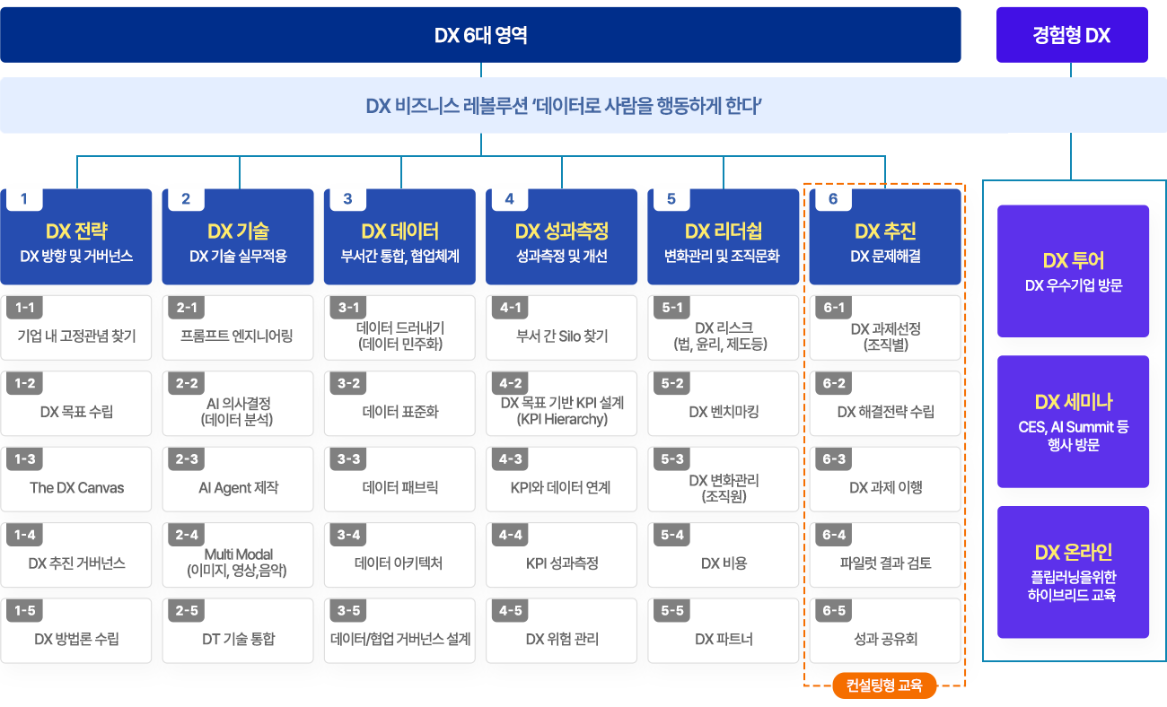 'DX 핵심 체계도'를 중심으로 실질적 DX 전환을 위한 세부 교육과정을 제공합니다.